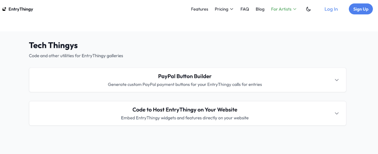 | EntryThingy | Artists pay directly into the gallery’s PayPal account; EntryThingy never touches or holds the funds. | Token-based: $3 per entry token. No onboarding fees. No platform percentage taken from artist fees. |